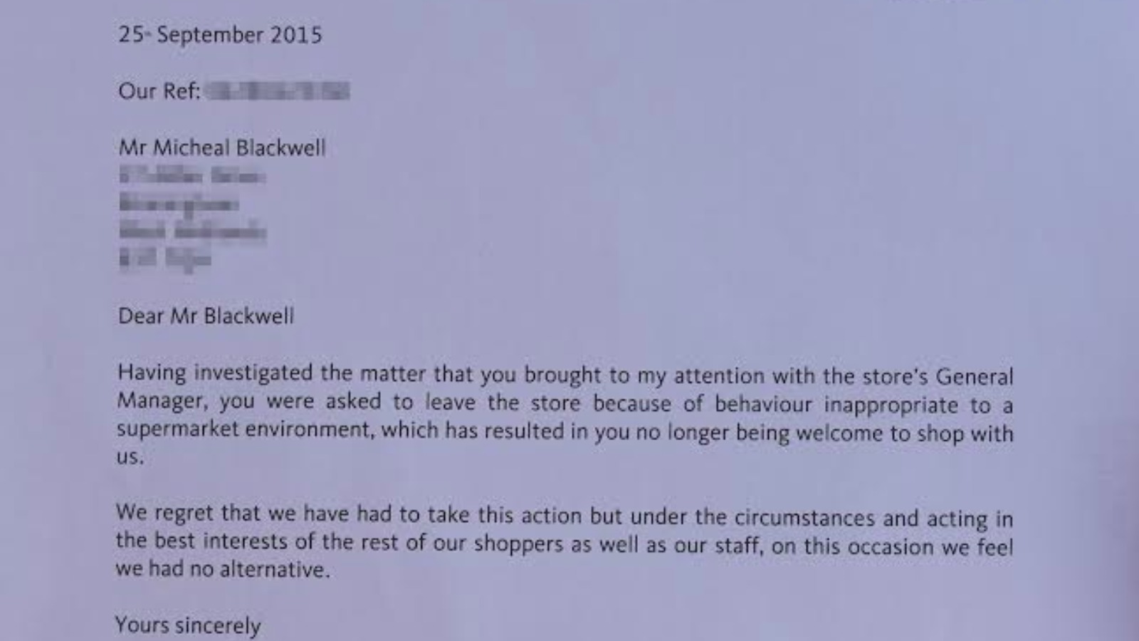 There is evidence to suggest that some groups do circulate known or problematic customers details who have been banned from one store. Jul 10, 2013 · letter from walmart. These are all legitimate reasons that a customer could be. Why was my husband banned from walmart store? Can a business ban a customer or refuse service? Banning notices are not enforced by the police. Store employees cannot and will not confront you about it. Woolf, over the past six months, your husband has caused quite a commotion in our store. Can a banning notice be issued by post? You are hereby prohibited from entering Fill out, securely sign, print or email your form letter how to ban someone from my business property instantly with signnow. You can then order them to leave. Politely tell them that you would rather they did not come into your store any more and that if they return in the future they will be trespassing.
