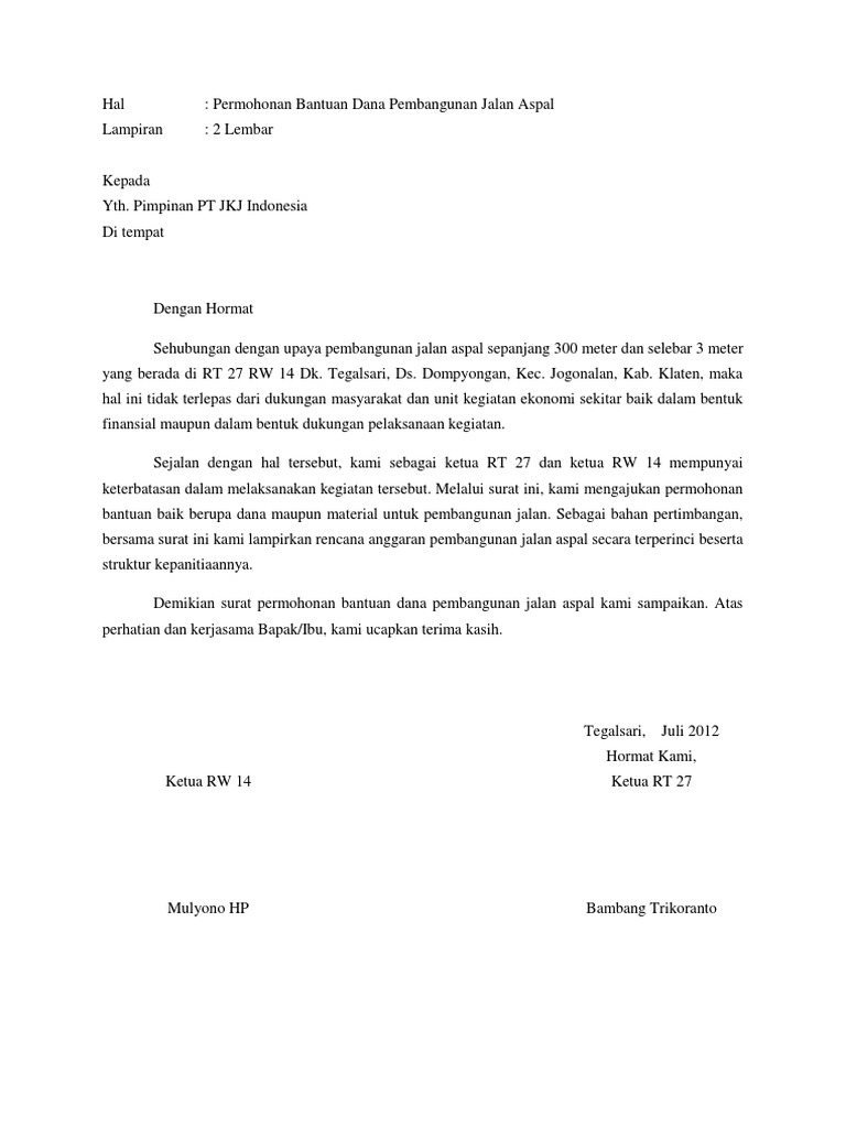 Contoh Surat Permohonan Jalan Lingkungan : Contoh Surat Permohonan Jalan Lingkungan Contoh Proposal Jalan Lingkungan Kue Kini Kani Bakery Jalan Mawar Melati Nomor 4 Magelang Jawa Tengah Telp 0274 665776749 Email Valerii Windy : Contoh surat permohonan izin hampir sama dengan contoh surat izin, akan tetapi jika surat permohonan izin adapaun keuntungan yang dapat anda peroleh dari kerjasama ini adalah:. Bapak menteri sosial di jakarta assalamu'alaikum wr. Berikut ini adalah contoh format proposal permohonan bantuan pembagunan jalan lingkungan desa. Contoh proposal pembangunan jalan lingkungan. Dengan ini, aku mengajukan surat permohonan keringanan biaya kuliah dengan lampiran sebagai berikut: Untuk itu, anda harus spesifikkan kebutuhan surat pengantar seperti apa yang anda butuhkan.
